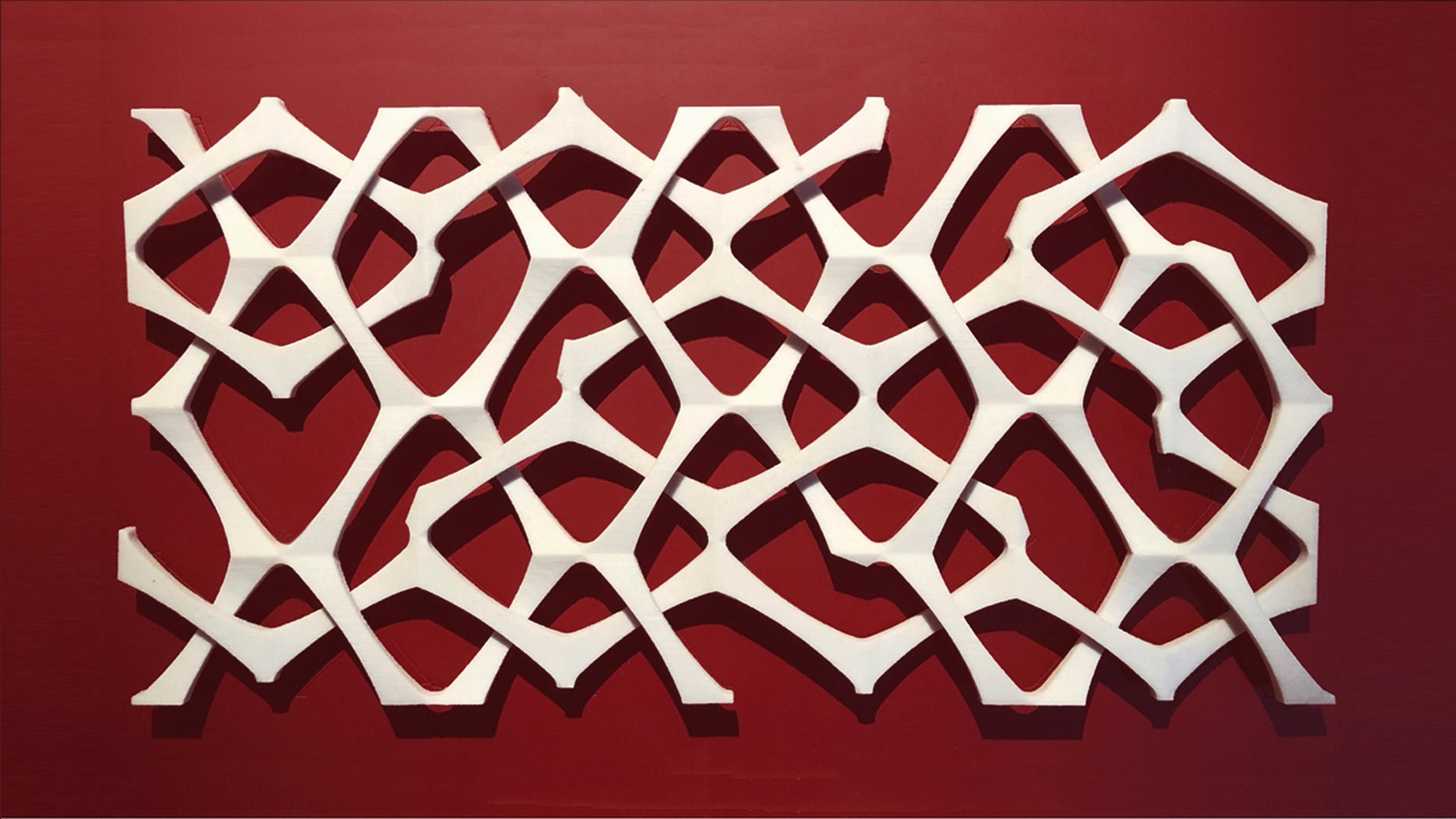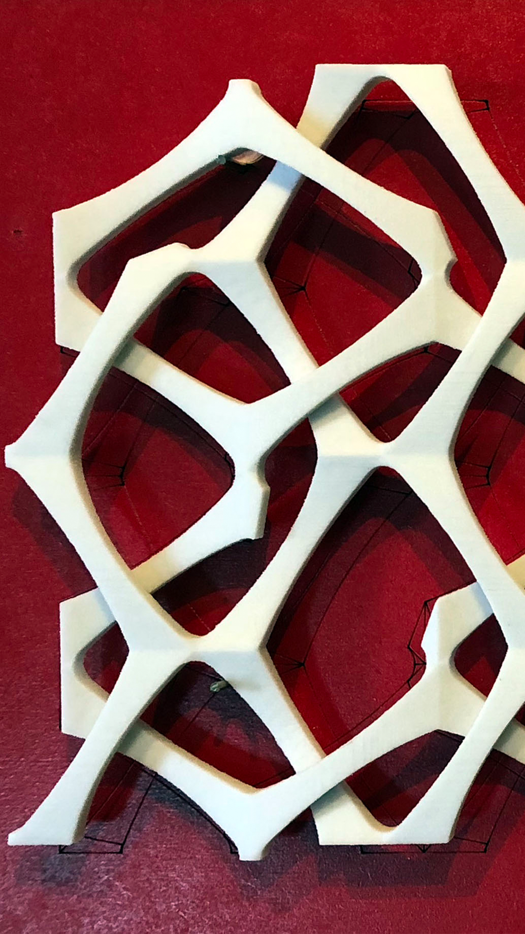 * Parametric design, laser-cut tension interlaced tension laminates featuring a natural wood finish.